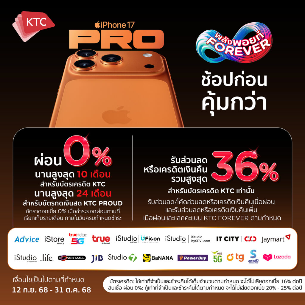 “เคทีซี” หรือ บริษัท บัตรกรุงไทย จำกัด (มหาชน) เปิดตัวแคมเปญพิเศษต้อนรับ iPhone 17 สมาร์ทโฟนรุ่นล่าสุดจาก Apple มอบข้อเสนอสุดคุ้มสูงสุดให้สมาชิกบัตรเครดิตและบัตรกดเงินสด “เคทีซี พราว” เป็นเจ้าของ iPhone 17 ได้ง่ายขึ้น พร้อมสิทธิประโยชน์สูงสุดถึง 30% ตั้งแต่วันที่ 12 กันยายน – 31 ตุลาคม 2568 ที่ร้านมือถือ ไอที และเครื่องใช้ไฟฟ้าชั้นนำทั่วประเทศที่ร่วมรายการ อาทิ Studio7, BaNANA, Power Buy, Jaymart, AIS, TRUE, DTAC, JIB, IT City, Power Mall และ Apple Store ที่ร่วมรายการ